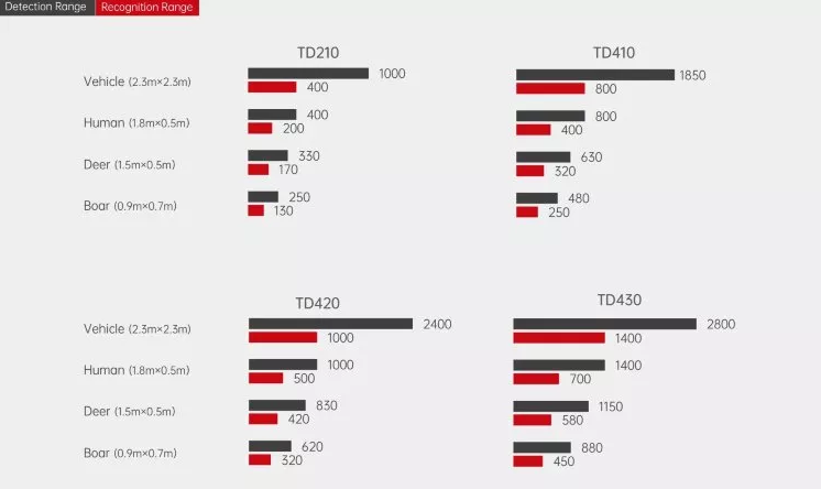 | Дальность обнаружения, м - транспортное средство (2,3x2,3 м) - человек (1,8x0,5 м) - олень (1,5x0,5 м) - кабан (0,9x0,7 м) |