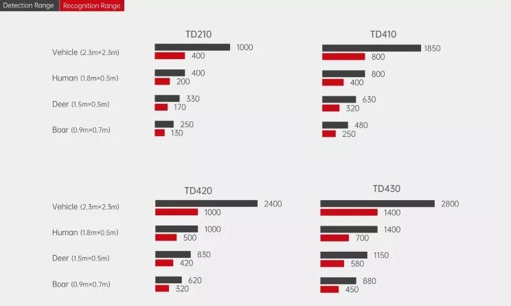 | Дальность обнаружения, м - транспортное средство (2,3x2,3 м) - человек (1,8x0,5 м) - олень (1,5x0,5 м) - кабан (0,9x0,7 м) |