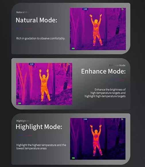 Жидкокристаллический микродисплей 1280×960 в окуляре характеризуется высокой чёткостью и улучшенной цветопередачей, а 3 режима наблюдения и 5 цветовых схем создают оптимальное по яркости и контрасту изображение в конкретных погодных и световых условиях. А видно всё так, как если бы наблюдатель смотрел не в окуляр, а на 22-дюймовый экран с расстояния в 1 м.