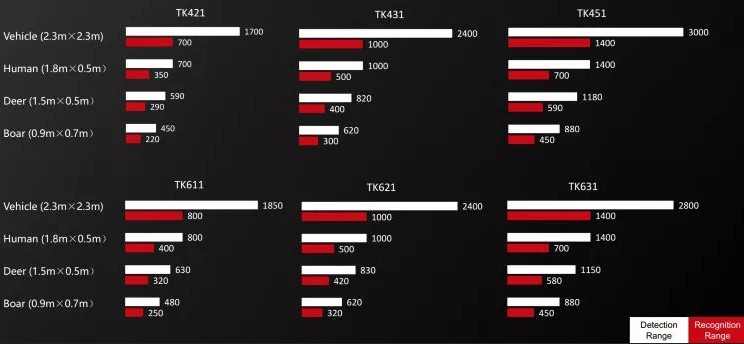 | Дальность обнаружения, м - транспортное средство (2,3x2,3 м) - человек (1,8x0,5 м) - олень (1,5x0,5 м) - кабан (0,9x0,7 м) |